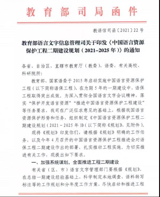 教育部语信司印发《中国语言资源保护工程二期建设规划(2021-2025年)》,旨在深入贯彻全国语言文字会议精神,落实“保护开发语言资源”“推进中国语言资源保护工程建设”等任务要求。规划提出,到2025年建成准确权威、开放共享的语言资源公共服务平台,产出系列标志性成果,努力将语保工程打造成文化传承工程、质量精品工程、引领示范工程。