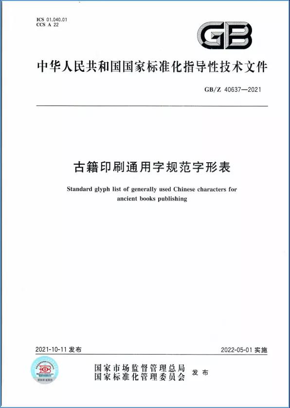 国家市场监督管理总局、国家标准化管理委员会发布《古籍印刷通用字规范字形表》(GB/Z 40637-2021)。该标准由教育部、国家语委组织研制,是新中国成立以来对传世古籍印刷字的第一次整理规范。该标准适用于传世古籍的印刷出版,以及现代书刊的繁体版印刷。其发布实施,对于推动语言文字规范化标准化信息化,传承弘扬中华优秀传统文化,建设社会主义文化强国都具有重要促进作用。