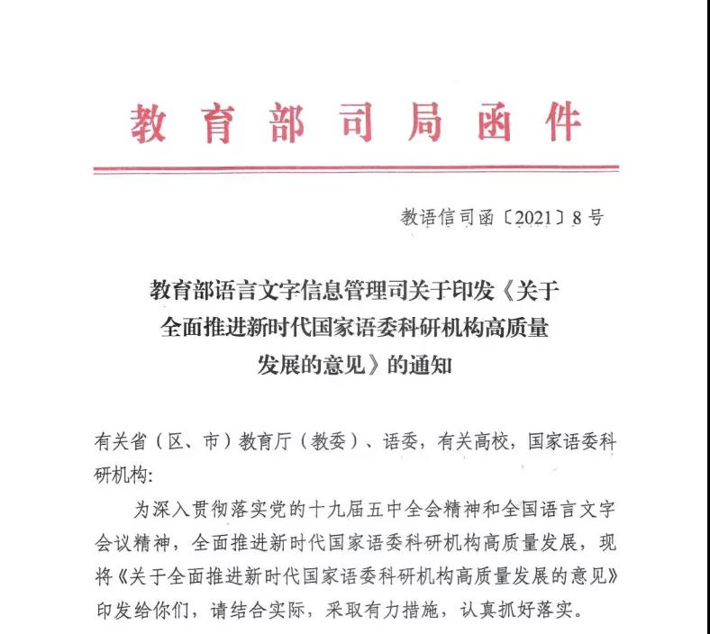 教育部语信司印发《关于全面推进新时代国家语委科研机构高质量发展的意见》,强化国家语委科研机构智库功能,促进特色发展,推动协同创新和内涵建设,全面提升科学研究和资政服务水平。