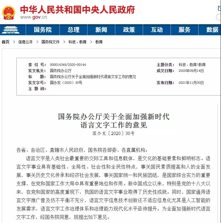 国务院办公厅发布《关于全面加强新时代语言文字工作的意见》,这是新中国成立以来第一次以国办名义下发的全面加强语言文字工作的指导性文件。