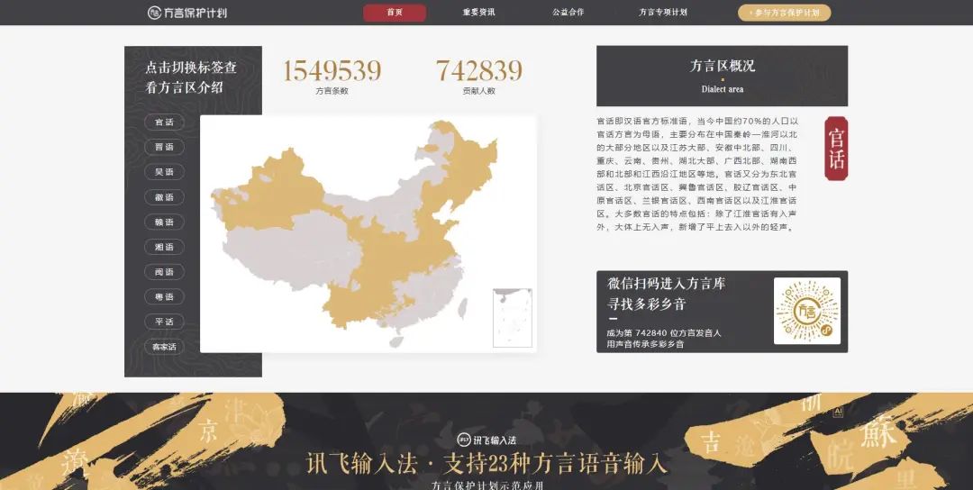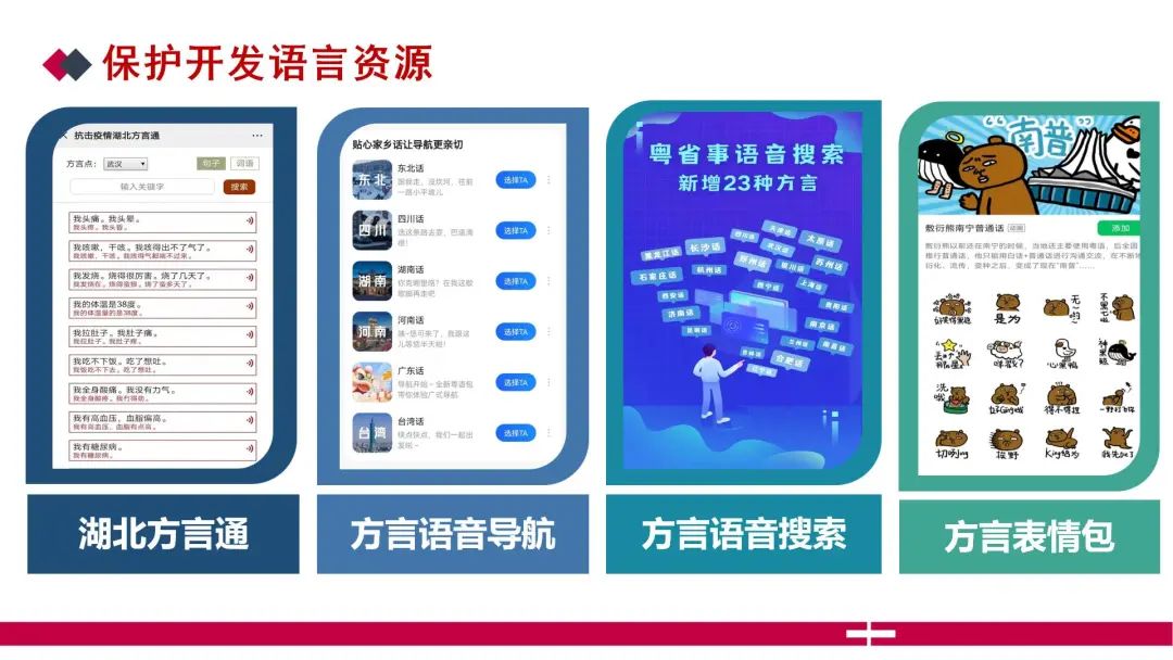 中国多个语言智能企业积极投入到方言科技产品的研发之中,最受关注的是濒危方言和使用人口多、通行区域广的方言。2017年,科大讯飞利用人工智能技术发起“方言保护计划”,通过人工智能技术实现多种方言的语音识别、语音合成及翻译,并利用这一技术实现对濒危语言的永久留存,现已有742837人次贡献了1549534条方言语音;同时,科大讯飞正在利用人工智能技术系统地研究濒危语言的语音结构、语言结构,尝试对部分濒危语言进行语音复制(祖漪清2018)。目前,在语音合成技术的支持下,湖北、上海、福建、浙江、广东、广西以及港澳台地区多地公共交通提供当地主要方言的报站服务,高德地图推出6种地方话语音包,百度地图“乡音”语音库采用“众包”方式搜集了包含全国上百点的地方话和地方普通话的语音包,可供在语音导航时选择使用。目前,讯飞输入法、搜狗输入法、百度输入法分别支持26种、10种、7种地方话的语音输入。此外,方言科技产品研发还能为国家重大需求提供语言应急服务(李宇明,赵世举,赫琳2020)。
